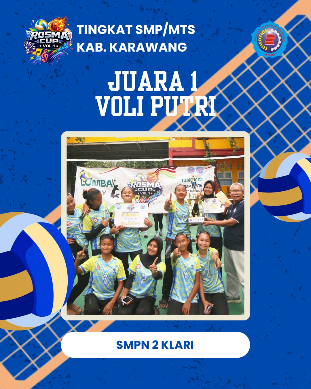 Juara Voli Putri Rosma Cup Vol. 1 tingkat SMPNMTs Juara 1 diberikan Kepada SMPN 2 KLARI