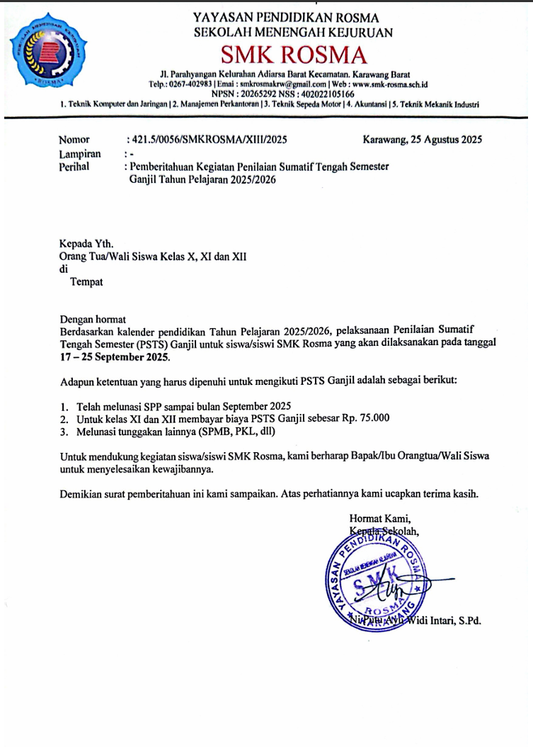 Berdasarkan kalender pendidikan Tahun Pelajaran 2025/2026, Penilaian Sumatif Tengah Semester (PSTS) Ganjil untuk siswa/siswi SMK Rosma yang akan dilaksanakan pada tanggal : 17 sampai dengan 25 September 2025.
