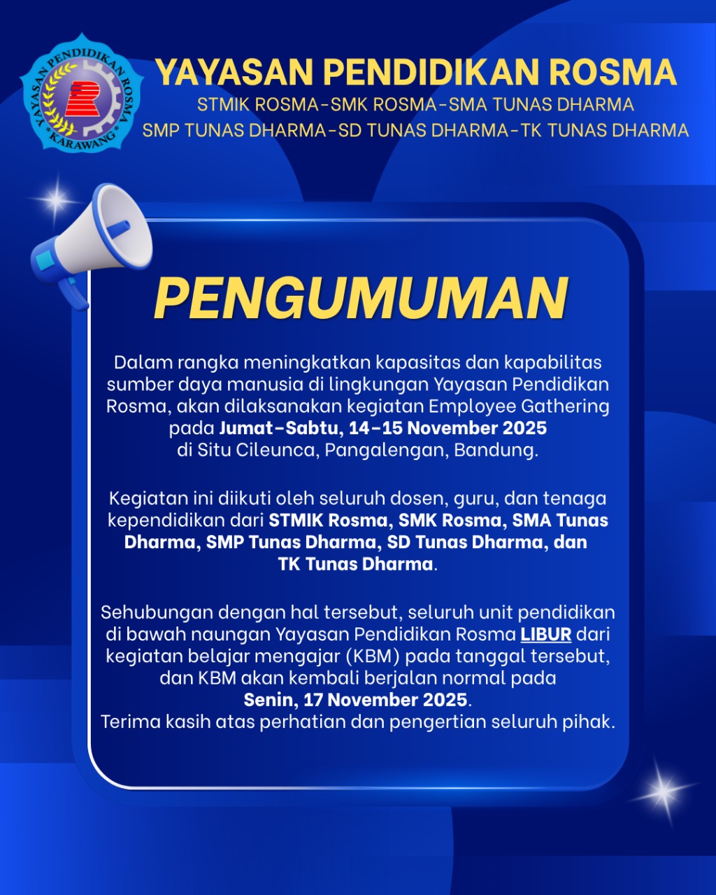Sehubungan dengan hal tersebut, seluruh unit pendidikan di bawah naungan Yayasan Pendidikan Rosma LIBUR dari kegiatan belajar mengajar (KBM) pada tanggal tersebut, dan KBM akan kembali berjalan normal pada Senin, 17 November 2025.